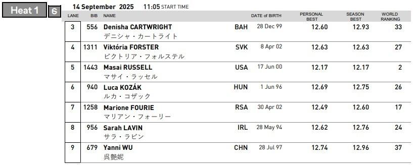 同组7位参赛选手当中,实力最强的无疑是美国选手拉塞尔。拉塞尔在巴黎奥运会上,曾以12秒33的成绩夺得金牌。今年5月份,她以12秒17的成绩创造了美国纪录,这是该项目的历史第2好成绩,仅次于世界纪录保持者阿穆桑的12秒12。