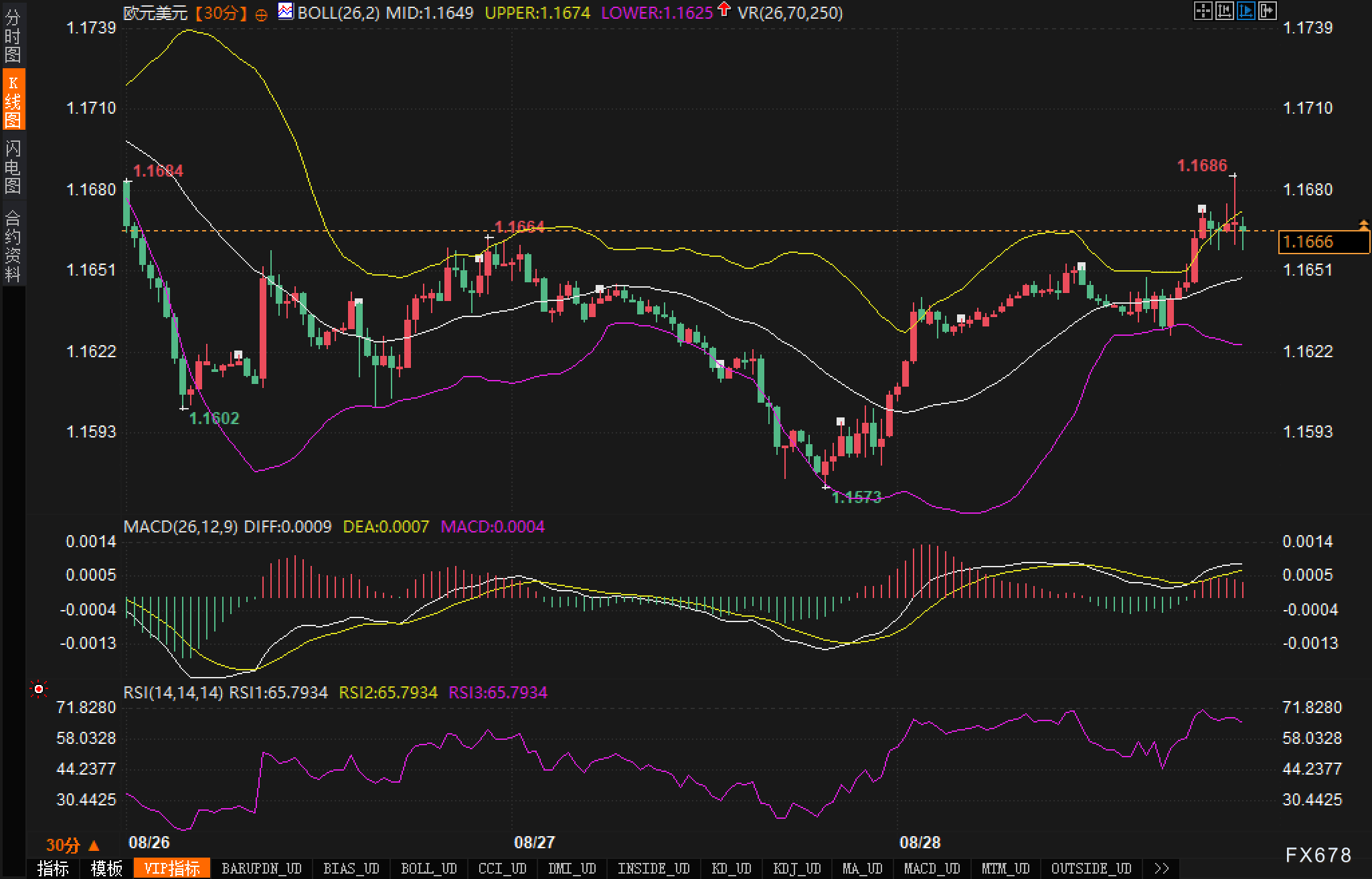 当前30分钟K线图配合布林带给出相对清晰的节奏:布林中轨位于1.1649,上轨1.1674,下轨1.1625。欧元在欧洲时段上攻至1.1686,短时“走带外”后迅速回归上轨附近整理,显示多头动能充足但亦存在获利了结。只要汇价稳于中轨之上,布林带“上移—回测—再上移”的节律仍成立。